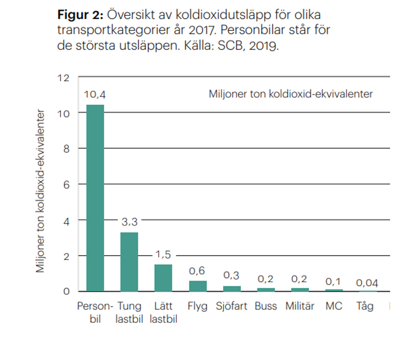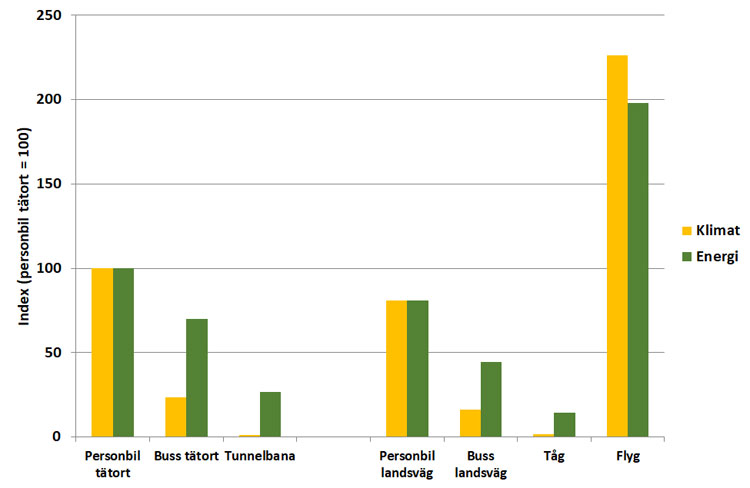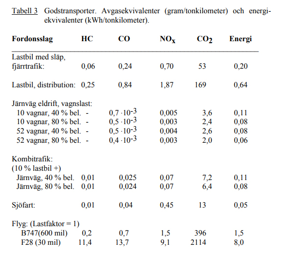 Siffror i tabellen ger en överblick hur de olika trafikslagen påverkar både energi och miljö. Här ser man också flygets stora inverkan. Det är uppenbart att så mycket som möjligt bör överföras till järnvägstransporter så snabbt det går. Det skall också påpekas att det är svårt att hitta jämförbar statistik och man måste alltid ta i beaktning vem som producerat statistiken och i vilket syfte.