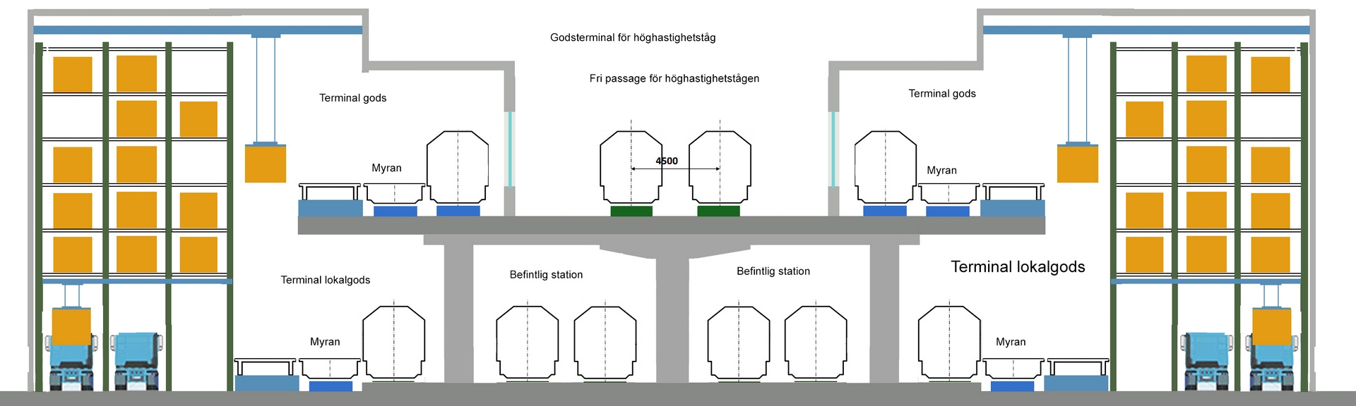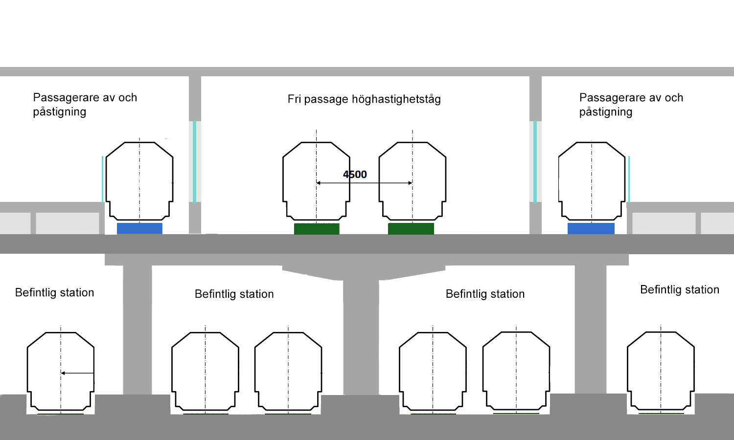 Höghastighetstågen kan ligga en våning upp i förhållande till den vanliga stationen